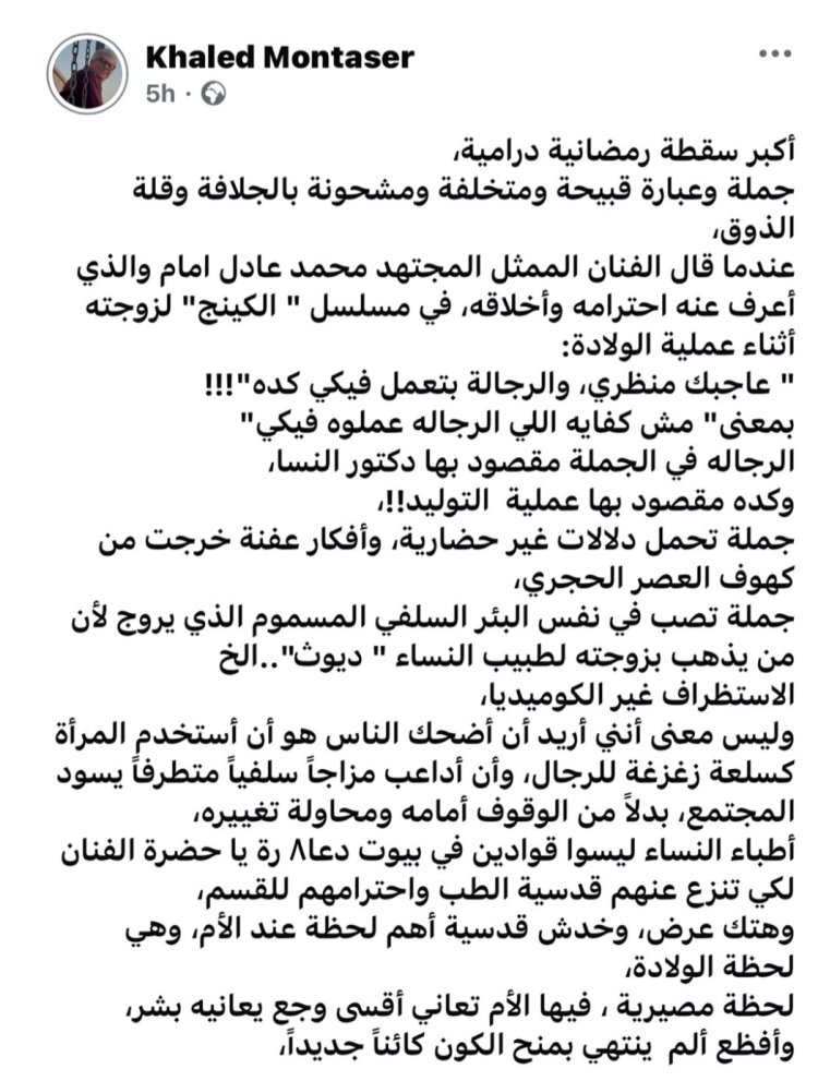 وأكد منتصر في منشوره أن محاولة انتزاع الضحكات من الجمهور لا تبرر بأي حال من الأحوال تقديم المرأة بشكل "سلعي" أو تكريس صور نمطية سلبية تتماشى مع الأفكار المتشددة، مشدداً على أن لحظة الولادة هي من أسمى وأصعب المواقف الإنسانية التي تتطلب تركيزاً فائقاً من الطبيب لإنقاذ حياة الأم والجنين، بعيداً عن السطحية و"الإيفيهات" العابرة.