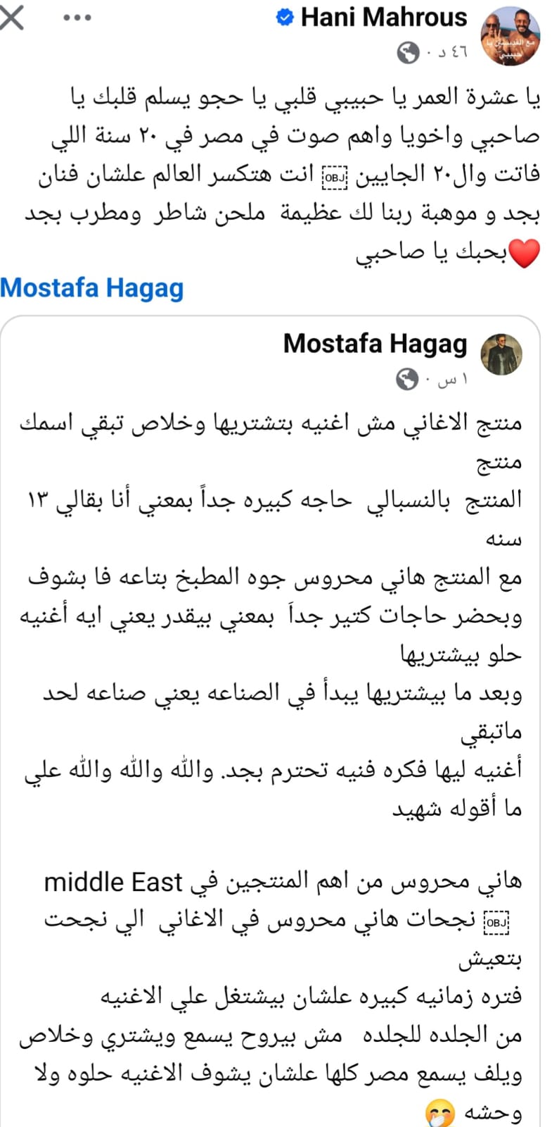 من جانبه، رد هاني محروس برسالة مؤثرة قائلاً: «أقدر جدًا مصطفى حجاج، فهو من أهم الأصوات في مصر خلال العشرين عامًا الماضية والقادمة، وأثق تمامًا في قدرته على تحقيق مزيد من النجاحات بفضل موهبته الكبيرة وإخلاصه لفنه».