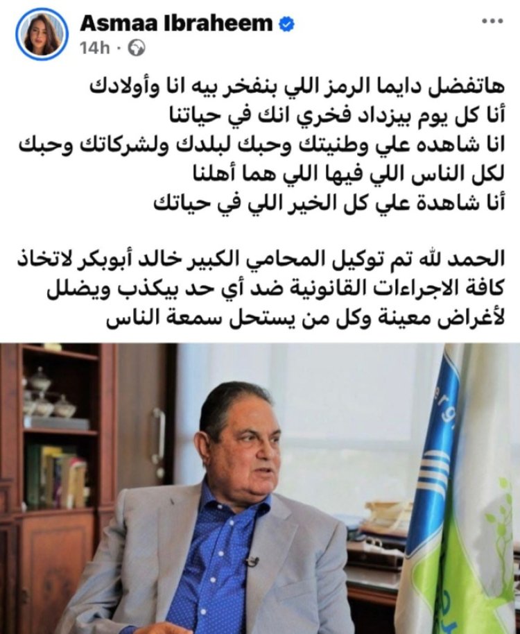 عبر حسابها الرسمي على موقع التواصل الاجتماعي "فيسبوك"، وجهت إبراهيم رسالة شديدة اللهجة، وصفت فيها زوجها بـ "الرمز الذي سيظل محل فخر"، مؤكدة أن ما يثار في الآونة الأخيرة ليس سوى حملة لتشويه السمعة وتضليل الرأي العام. وقالت أسما في منشورها: "أنا كل يوم بيزداد فخري إنك في حياتنا"، مشيرة إلى أن زوجها يمتلك سجلاً حافلاً بالأعمال الوطنية والخيرية التي تشهد على إخلاصه لبلده.