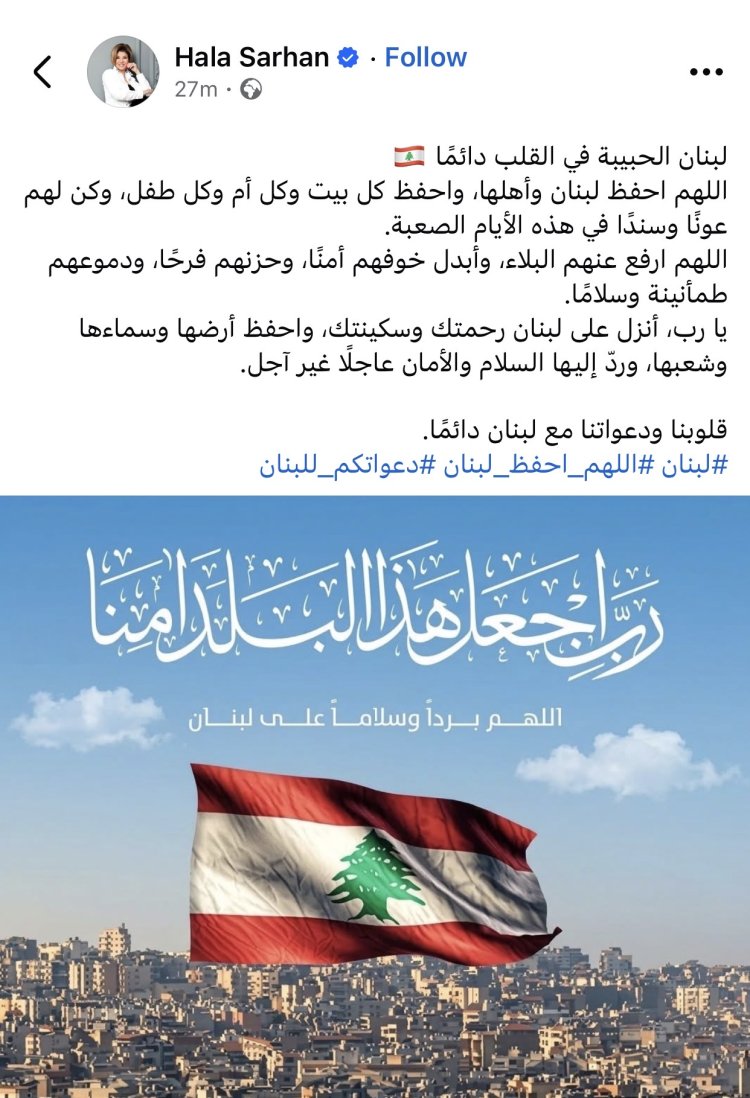 ونشرت عبر حسابها الرسمي على موقع "فيسبوك" رسالة دعم مؤثرة، دعت خلالها الله أن يحفظ لبنان وشعبه، قائلة إن لبنان سيظل دائمًا حاضرًا في القلب، متمنية الحماية لكل بيت ولكل أم وطفل في هذه الأوقات العصيبة.