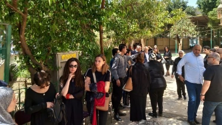 ساند الفنان سيد رجب زوجته فى جنازة والدها الذى يقام فى مسجد أسد بن الفرات بالدقي وحرص على استقبال المعزين.
