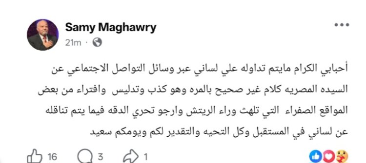وفي بيان نشره عبر حسابه الرسمي على منصة "فيسبوك"، وجه مغاوري رسالة حازمة لمتابعيه وللوسط الصحفي قائلًا: "أحبابي الكرام، ما يتم تداوله على لساني عن السيدة المصرية كلام غير صحيح بالمرة، وهو كذب وافتراء من بعض المواقع الصفراء التي تلهث وراء الريتش".