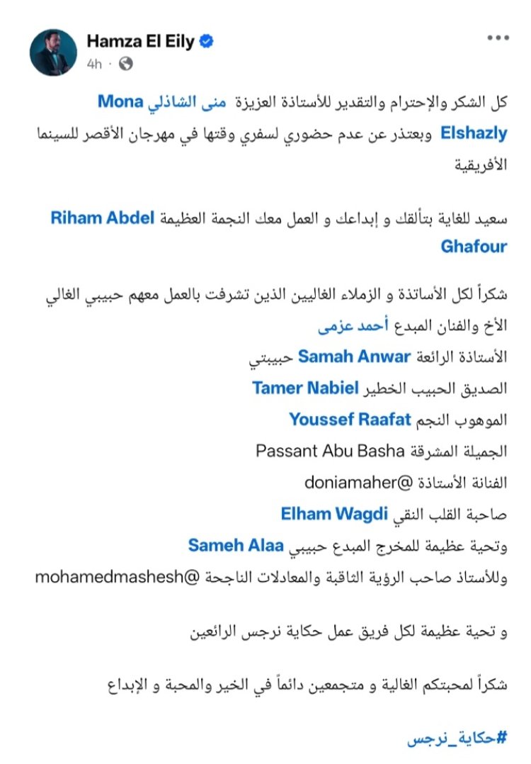 كما وجه الفنان الشكر للمخرج سامح علاء، والمنتج محمد مشيش، مشيداً برؤيتهما الفنية التي ساهمت في خروج "حكاية نرجس" بصورة تليق بالجمهور، ومؤكداً على متانة العلاقة التي تجمع كافة أفراد العمل.