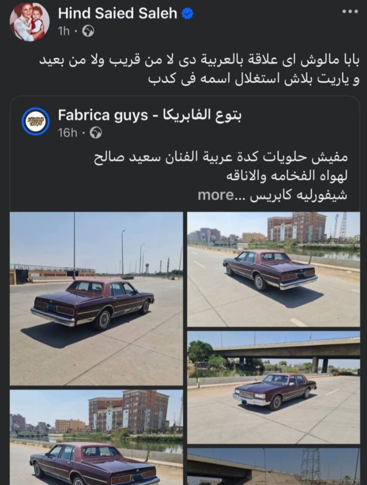 أوضحت هند، عبر حسابها الرسمي على موقع "فيسبوك"، أن الصور المتداولة لسيارة قديمة يتم الترويج لبيعها تحت اسم والدها لا أساس لها من الصحة، قائلة: "بابا مالوش أي علاقة بالعربية دي ولا من بعيد ولا من قريب، وياريت بلاش استغلال اسمه في كدب".