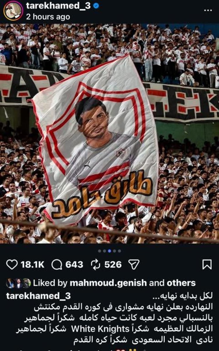 أعلن طارق حامد، لاعب وسط نادي الزمالك ومنتخب مصر السابق، اعتزاله كرة القدم رسميًا، اليوم السبت، وذلك في منشور عبر حسابه الرسمي على موقع “إنستجرام”.