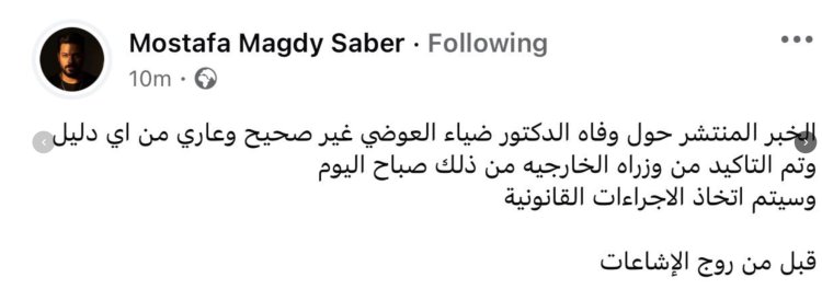 نفى المحامي مصطفى مجدي صابر ما تم تداوله خلال الساعات الماضية بشأن وفاة الدكتور ضياء العوضي، استشاري التغذية العلاجية، مؤكدًا أن هذه الأنباء غير صحيحة تمامًا ولا أساس لها من الواقع.