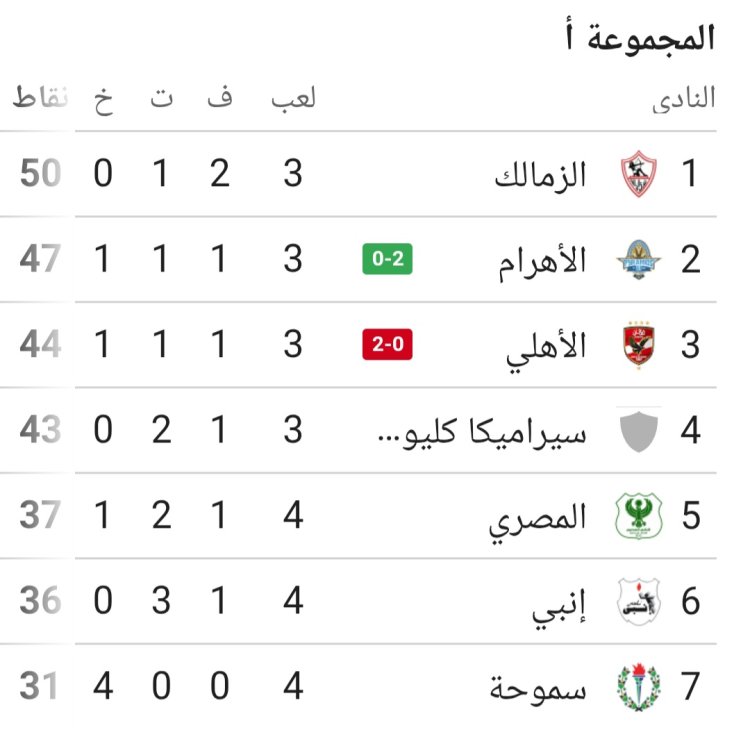 جدول ترتيب مجموعة بطل الدوري بعد تعادل الزمالك وسقوط الأهلي